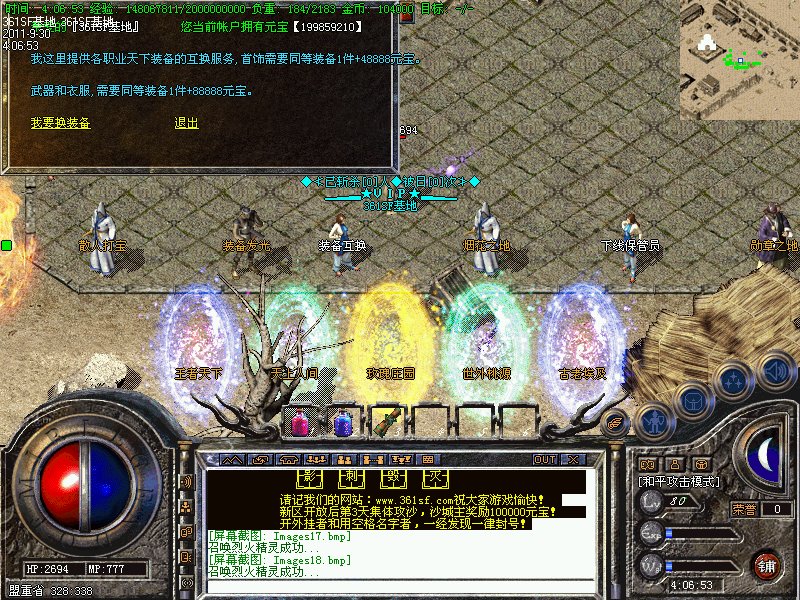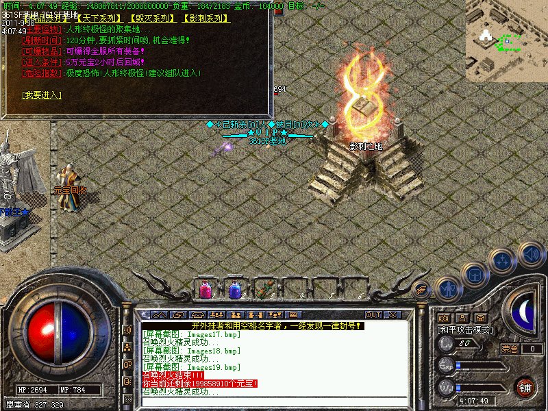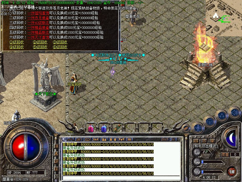 提示:本服务器高级怪物30分钟刷新,沙宝阁怪物60分钟刷新,新衣服暴率为1/30。赤月首饰暴率为1/10,赤月武器1/20。武器最高可升级7点,1分钟可取。祖玛教主,烟花恶魔,赤月恶魔出屠龙嗜魂,地藏王出霸者之刃!