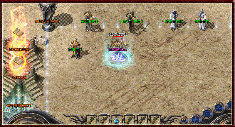 22.抗日战场,进入等级需要85级,里面怪物刷新快,爆率高,装备好,想获得好装备的。是你的必进之地!【此地图最新添加人形怪,主宰,必杀,元宝爆率超高】