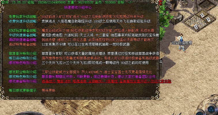 新人创业乐园:蚂蚁洞是升级跟打装备回收元宝最快的地图,天外飞石在盛大陈天桥那经验兑换可以换1亿经验,升级嗷嗷快!