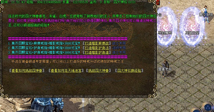 【特殊刷新】用魔法神石在土药旁边的魔法结阵可召唤出蚩尤.同时可获得丰富的奖品.--即本服的所有装备都可送出!