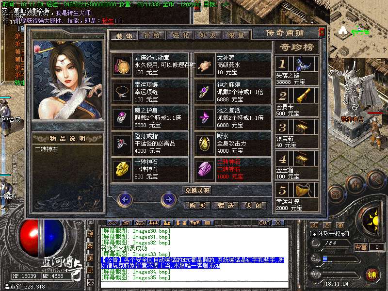 传奇套:传奇衣服+武器 2.2 倍攻击 HP+10000 MP+10000 防+500 传奇衣服 麻痹复活属性 6件传奇首饰触发 防 + 600