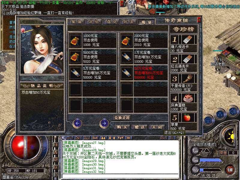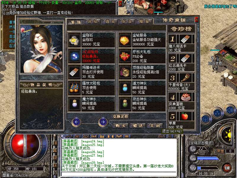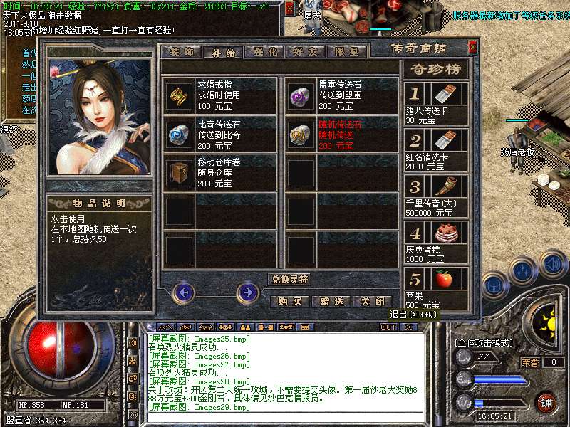 [介绍]服务器最新增加了等级任务系统,每10级服务器会自动送出任务传送卷,进入指定地图.90级任务赠送[屠龙(卓越),嗜魂(卓越),霸者(卓越)],100级任务赠送[传奇之刃]