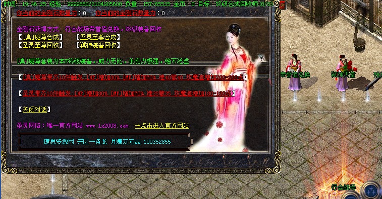 【10】:行会战场两小时举行一次,可以进去半个小时,每30秒增加100点荣誉值和300万经验,荣誉值可以直接兑换(金刚石)。