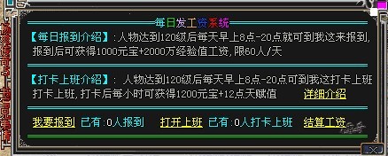 7.工资系统:人物到120级时,即可到(打卡上班NPC)报到及打开上班,每天报到奖1000元宝,打卡1200YB/小时