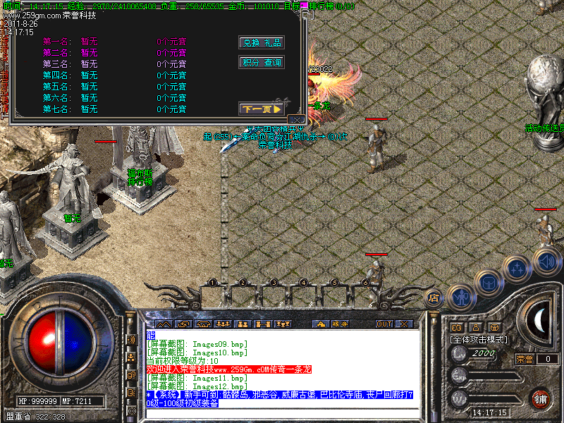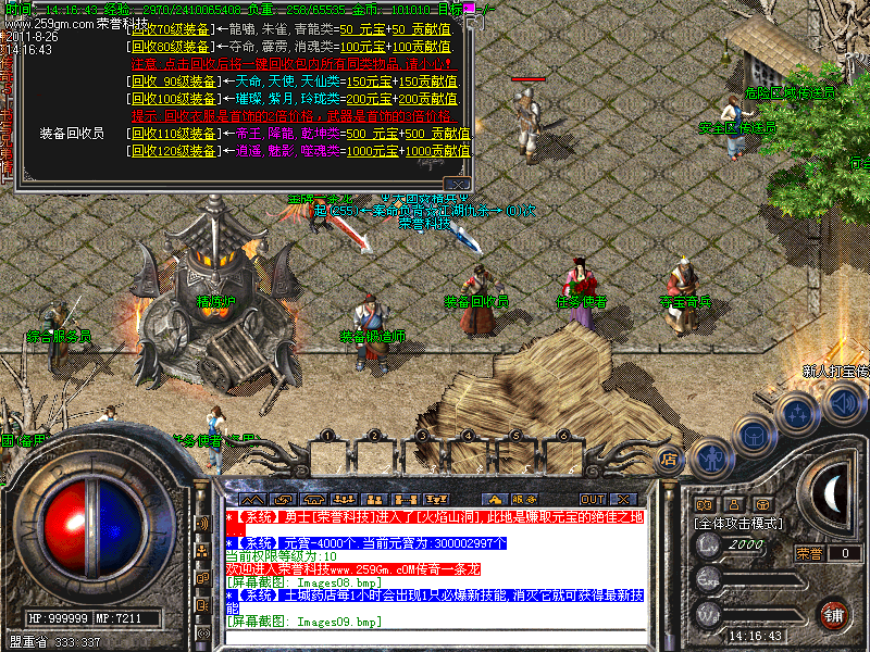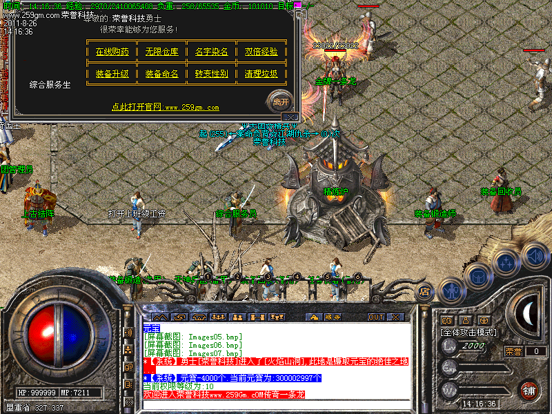 15.开区后的第3天集体进行首次攻城,奖励40万元宝,皇宫内管理员领取,此后天天拿沙奖励10万元宝