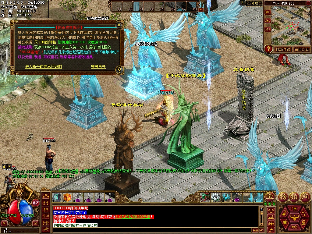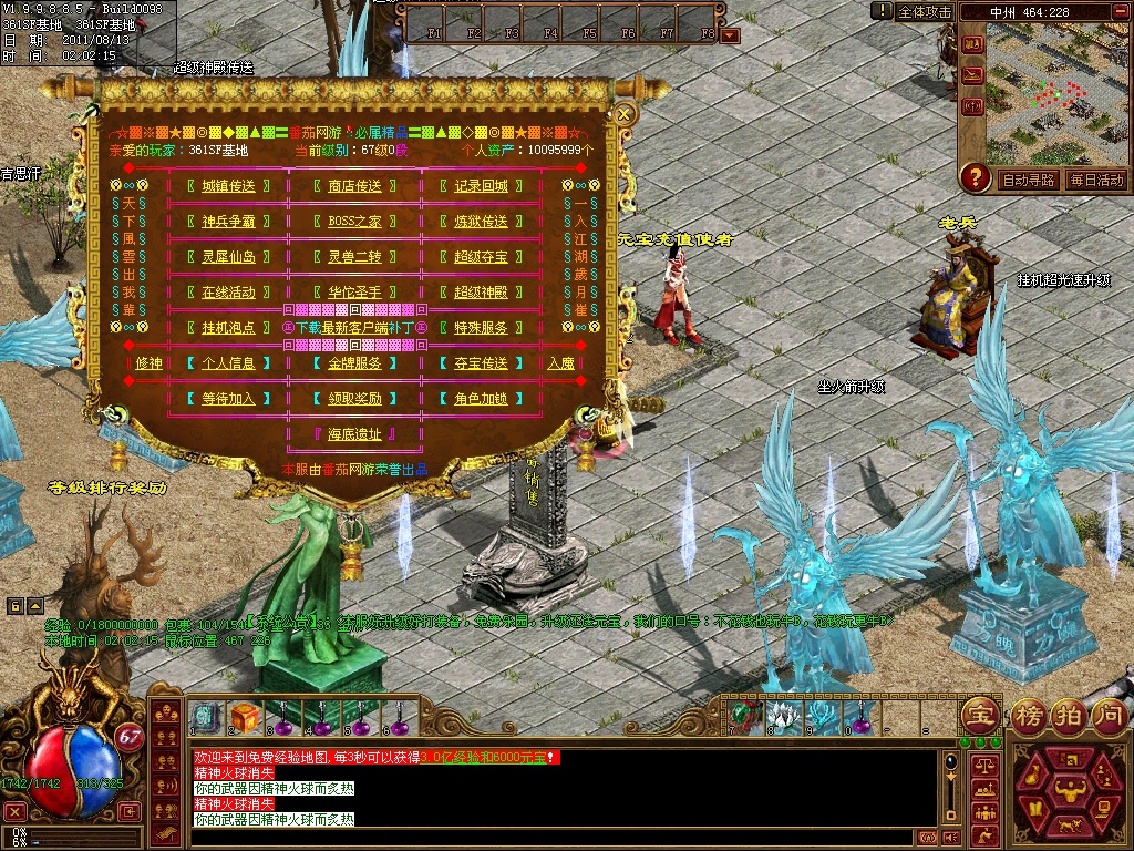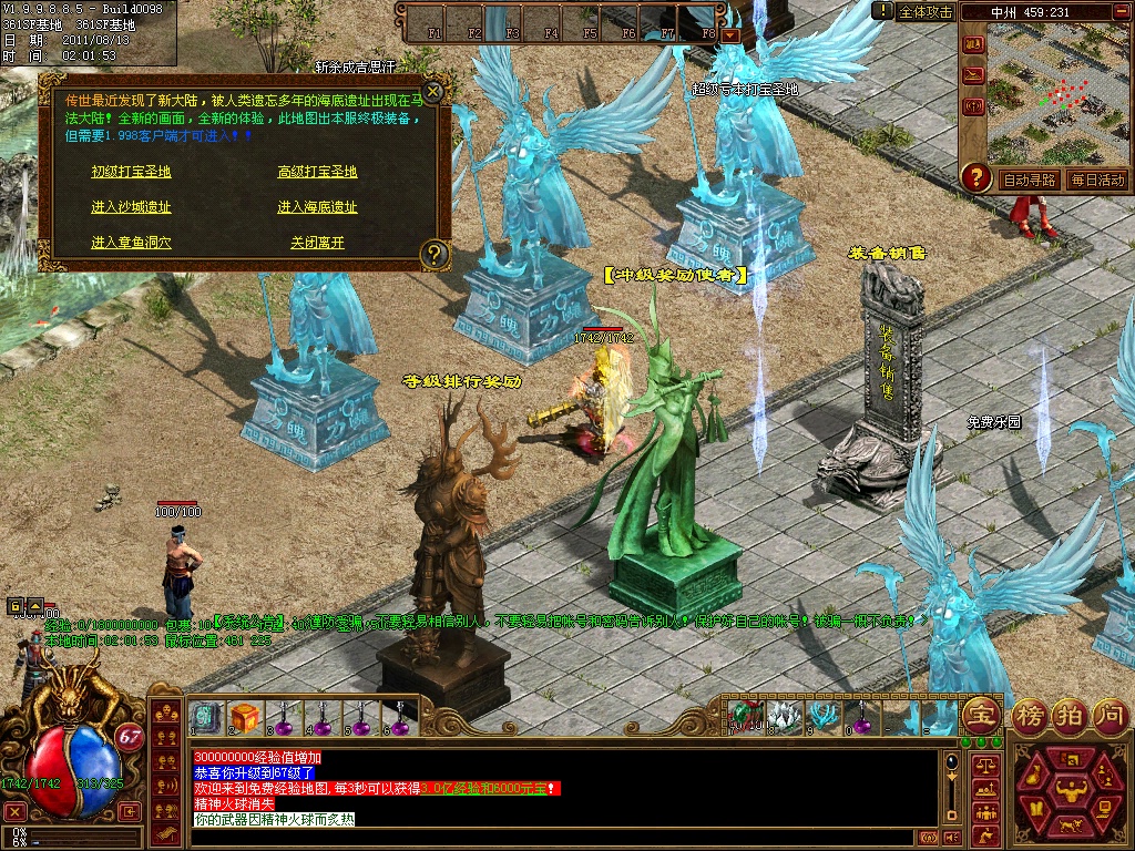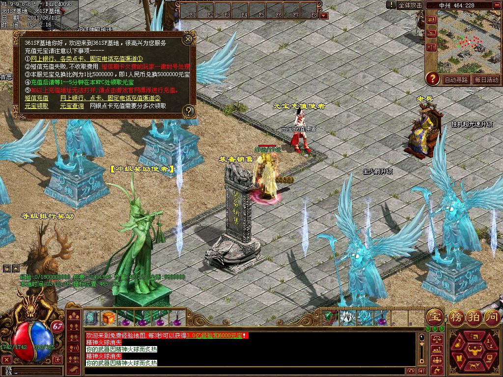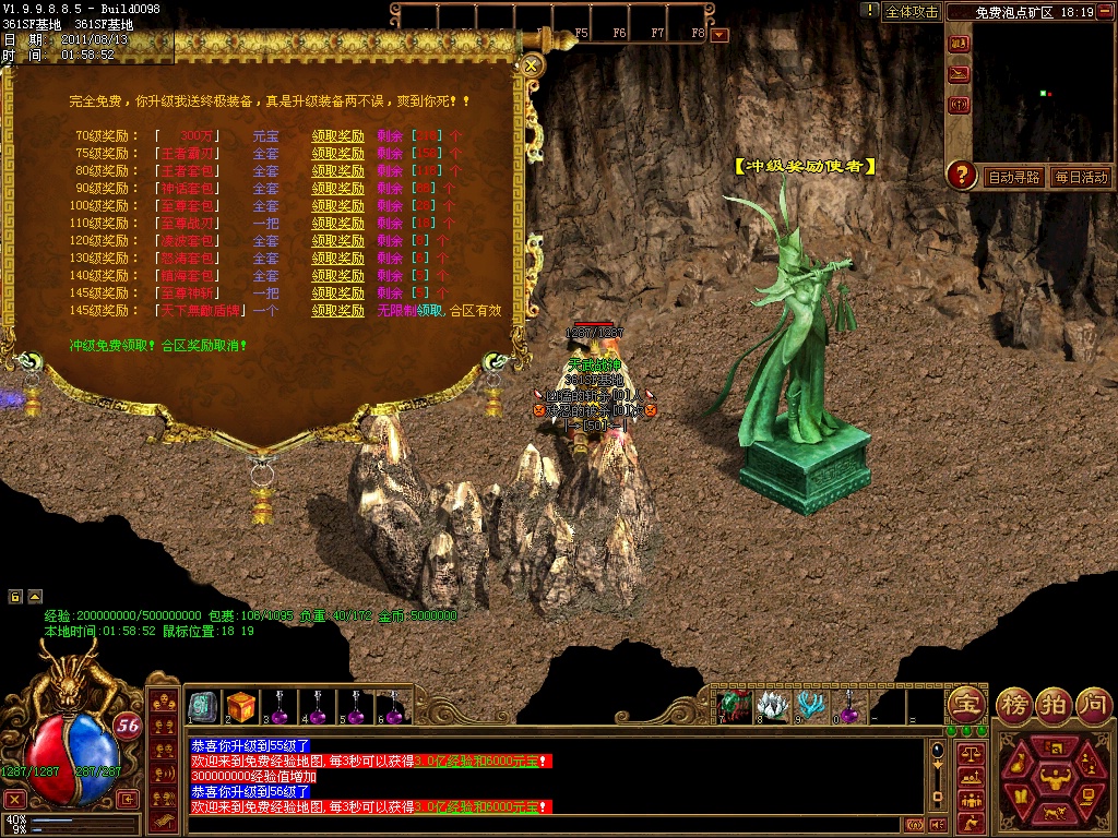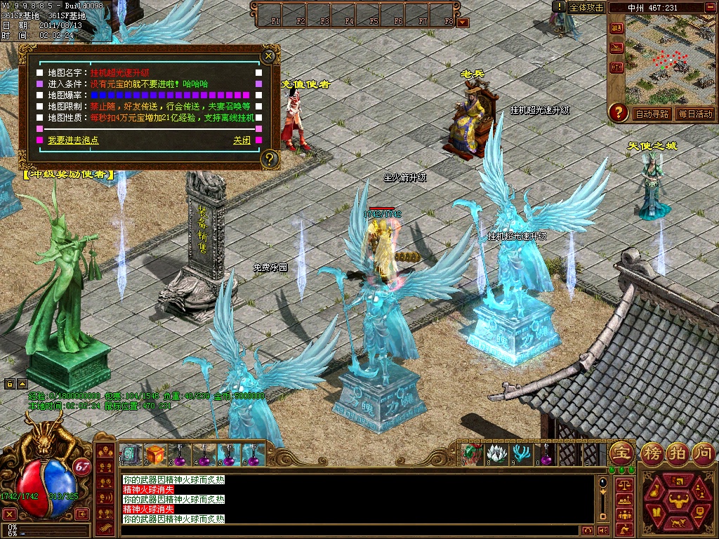 12、练级地图-本服(免费、元宝、离线)泡点地图 封顶147级。本服只要花了时间你就和RMB玩家一样的牛B,这绝对不是说说而已,时间=元宝 时间=装备 时间=等级 时间=牛B