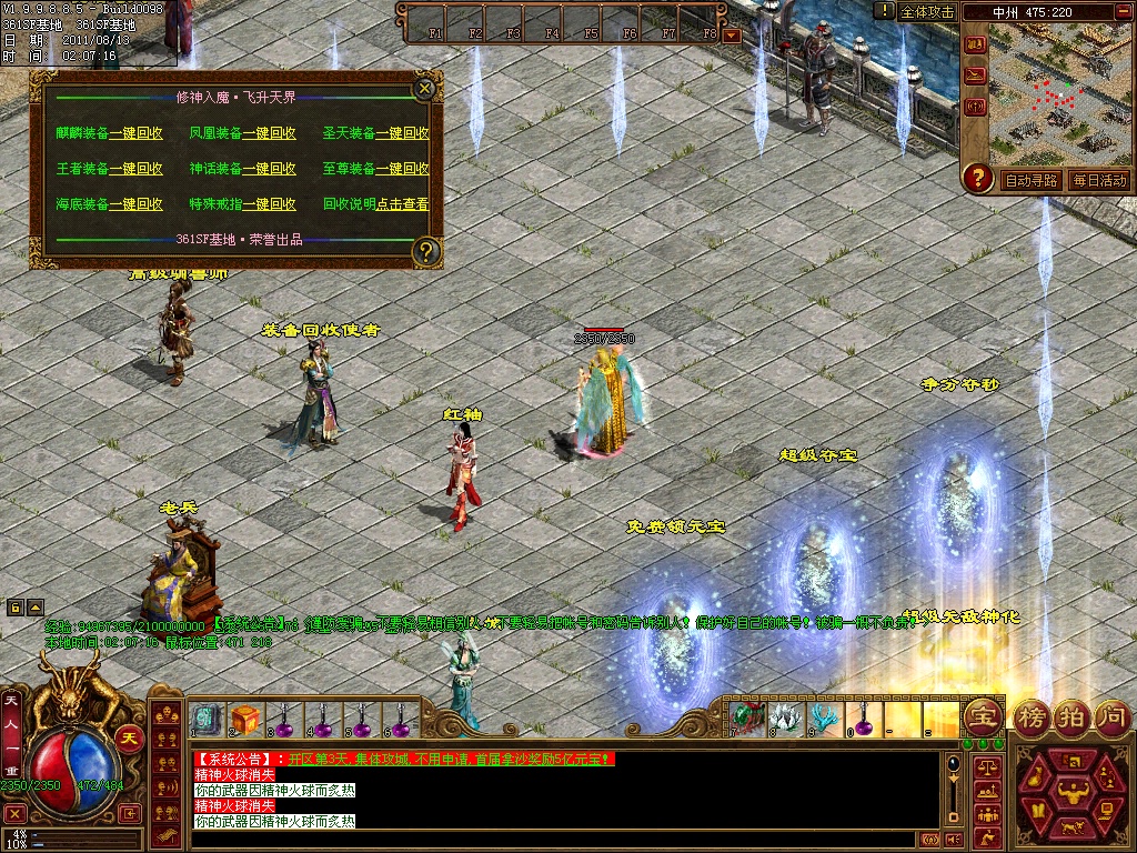 11、装备融合-装备合成是本F一大特色.合成免费.只需要花一定的时间就可以把中级装备合成高级装备,装备回收方面采用最新的一键回收全包装备脚本,节省时间为你赢得更多元宝!