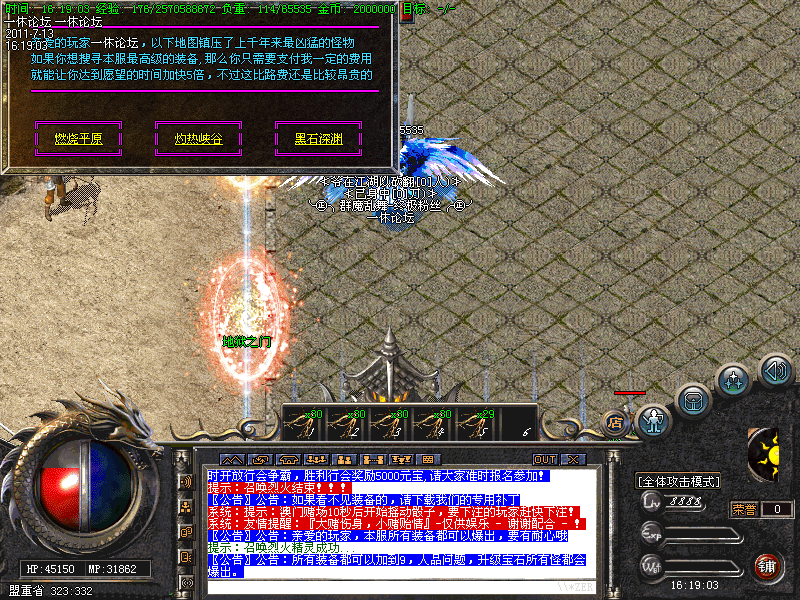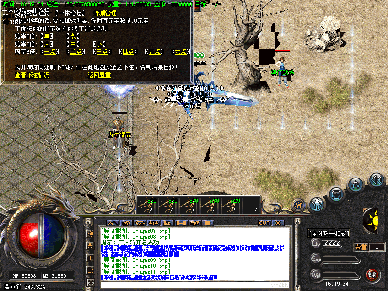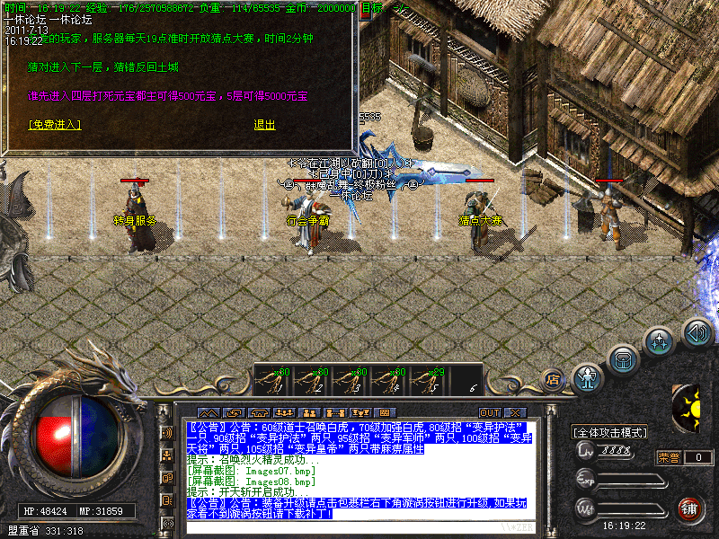 每日19点准时开放猜点活动,奖励5500元宝,19点05分准时开放行会争霸,胜利行会奖励5000元宝,请大家准时报名参加!