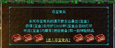 [254]特色二:本服所有装备都有爆,而且装备爆率较高,免费泡点地图可爆出初级装备,狂暴地图可爆出恶魔套装及以下所有装备.夺宝奇兵内打开宝盒可获得[绝世装备]!