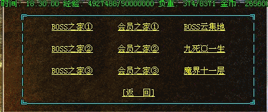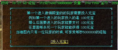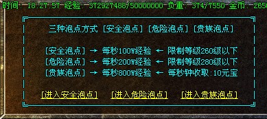 [250]特色一:快速的升级模式,免费泡点,每秒100W经验。[激情殿堂]只有一人在地图内的时候每秒获得经验500W.从传送员进入[贵族泡点]每秒享受1亿经验