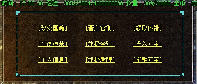 各位PK高手请注意新增的游戏热键: Alt+T 交易 | Alt+S 道士下毒模式(互换,绿毒,红毒) | Alt+I 打开包裹 | Alt+P 组队窗口 | Alt+C 人物窗口