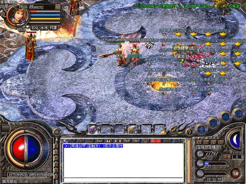 (*)每晚攻沙后,22:30--23:30,在[土武器店门口]附近每隔5分钟发放10000元宝、一千万经验卷