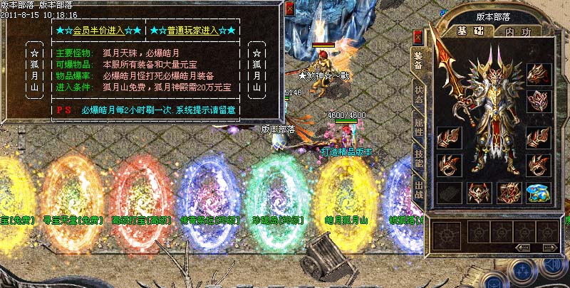 超多功能、地图:传功修炼、行会争霸、十二天书、朱火剑阵、狐月山、珍珑岛、充值积分、特戒购买、称号竞价等等