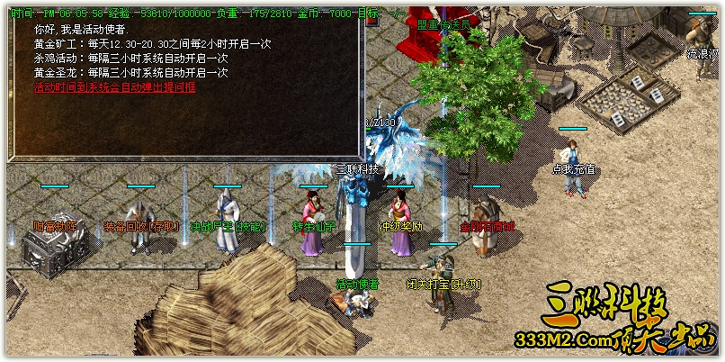 9.【每2小时系统自动提示获得 <黄金矿工> 可以挖出、元宝、经验、装备。每20分钟刷出元宝树,必爆5000元宝,每小时系统传送杀鸡活动,其中一只爆高级装备,后续将增加杀人比赛,敬请期待】