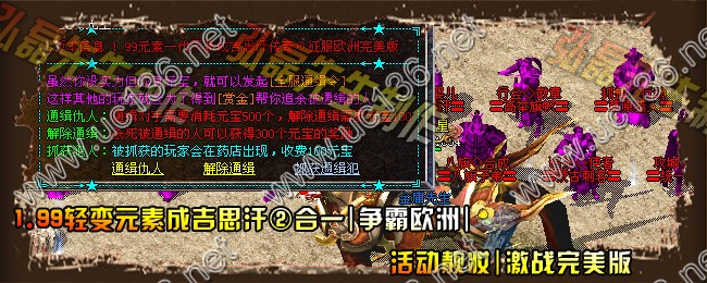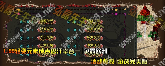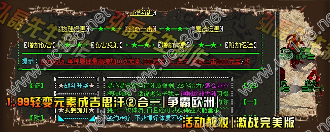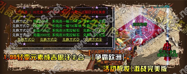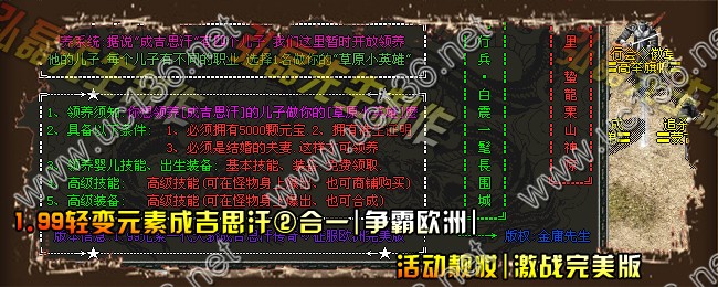 【版本信息】:欢迎大家进入2011年07月最新火爆1.99轻变元素成吉思汗、争霸欧洲、活动靓妆、激战完美版, 功能最多 地图最多 美妙滋味 需玩家慢慢品味。。