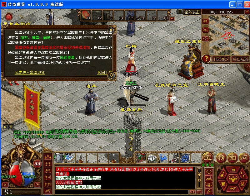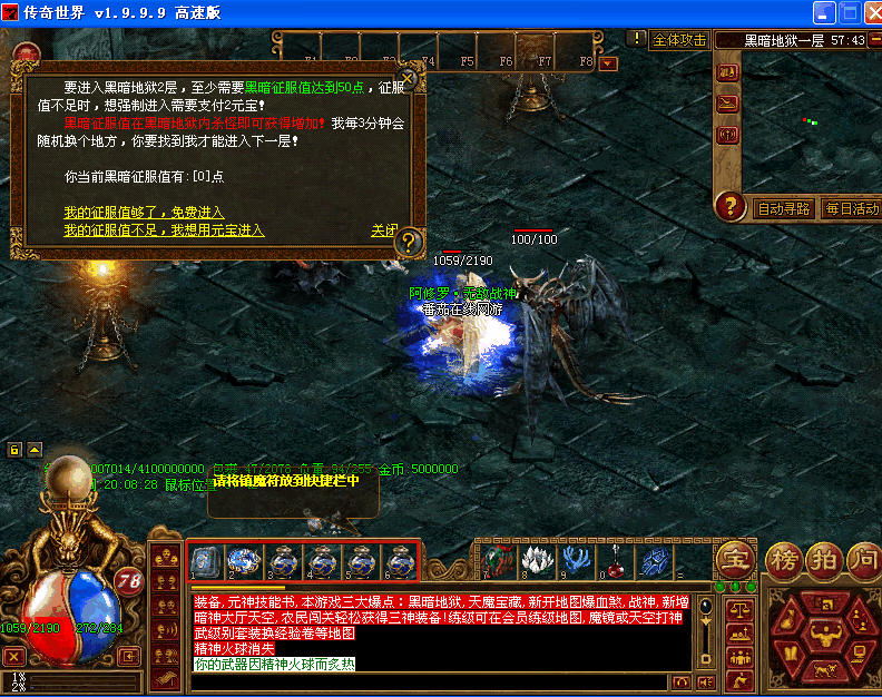 本服版本为1.9996黑暗地狱综合版,支持骑战、元婴、神威狱、天魔宝藏、强化技能、黑暗地狱,海底世界等功能!