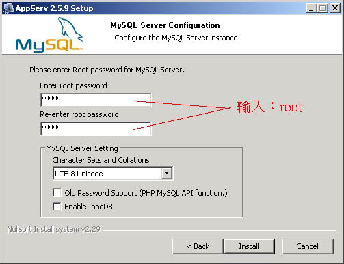 第一次导入数据库,需输入安装 AppServ 时,所设置的密码 root : 图2