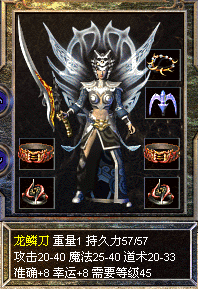 武器 龙鳞刀 攻击20-40魔25-40道20-33准确+8幸运+8 170 45