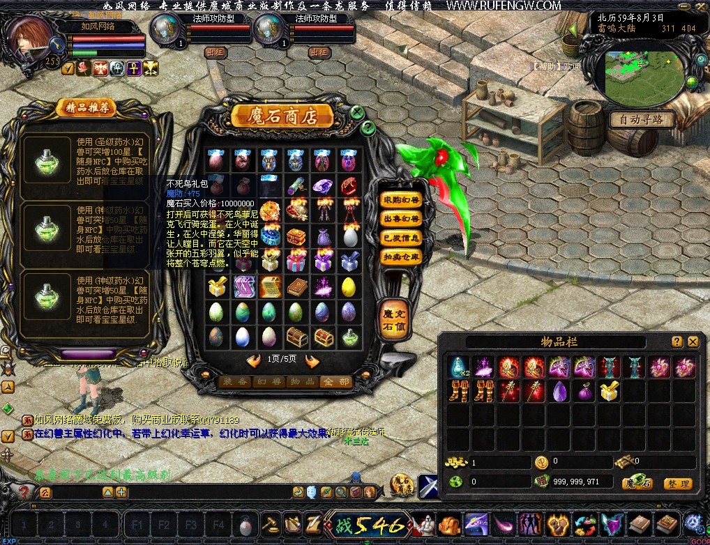 3、新增加凤凰坐骑,卫兵队长BB,至尊神龙王,骑宠、黄金坐骑等礼包进化400星,随身NPC里可以直接购买