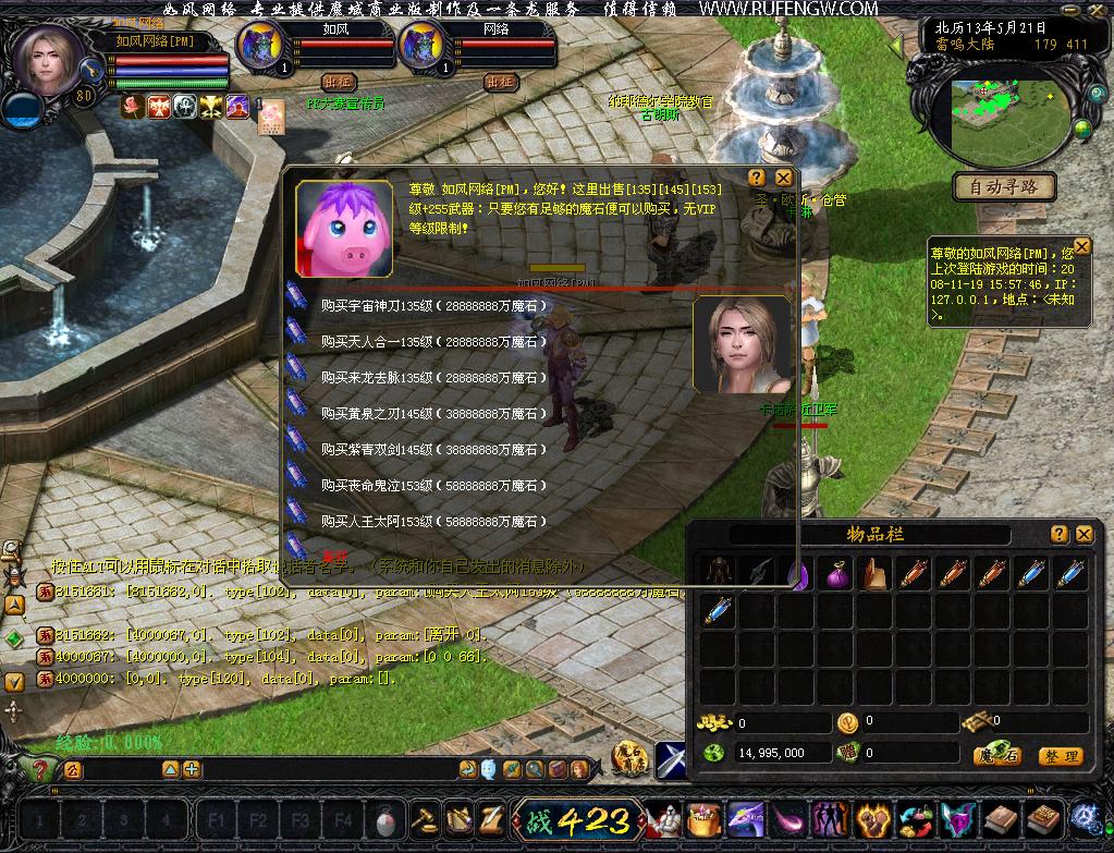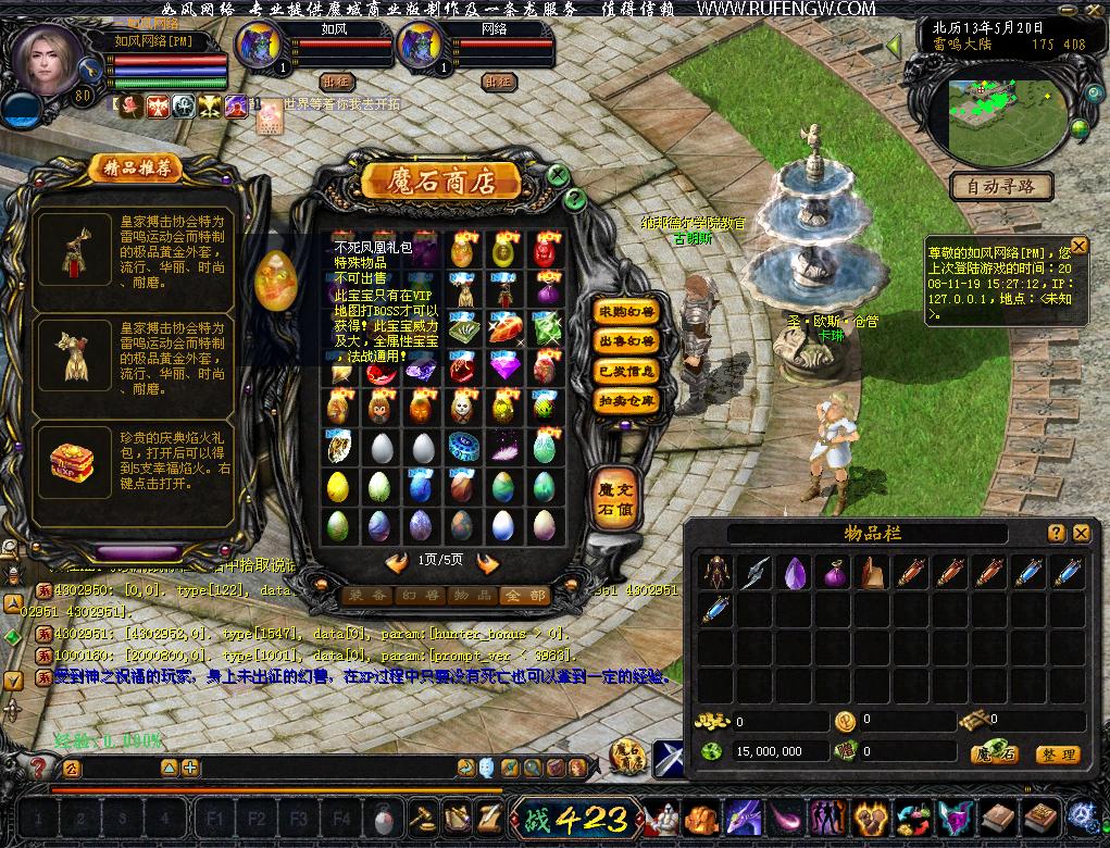 领工资,远程幻化宠物,BOSS传送,城市传送,洗去红名,出售最新7种加255神器等... ... 所有的功能分