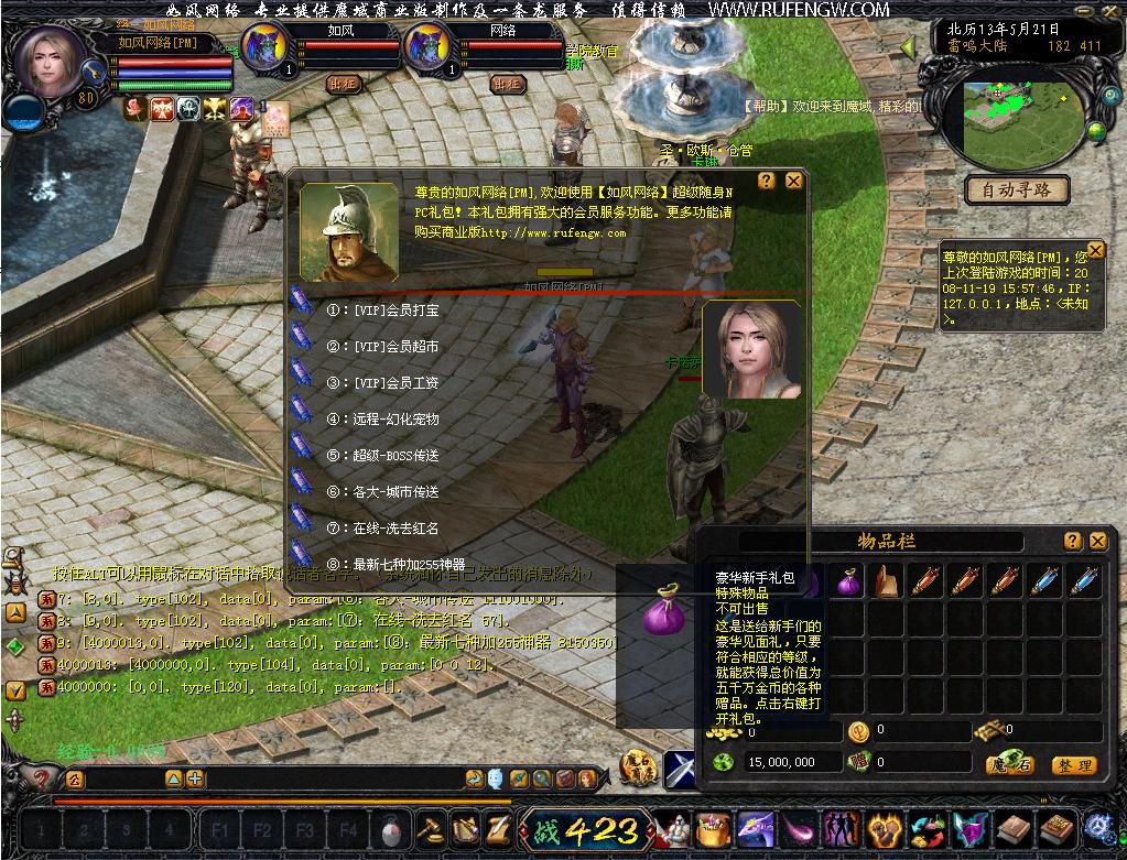 2.新人上线送VIP3、+12双洞套装、全套技能书,豪华新手礼包及游戏NPC指南,免费版设置为上线80级。