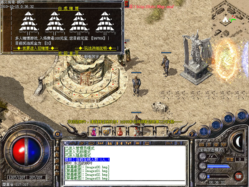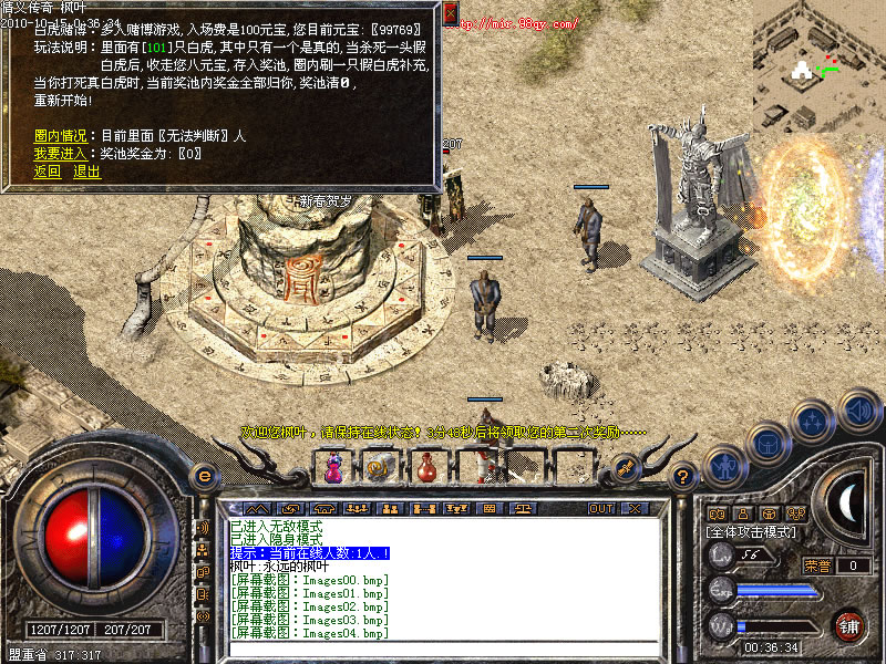白虎赌博:多人赌博游戏,入场费是100元宝里面有[<101/SCOLOR=250>]只白虎,其中只有一个是真的,当杀死一头假