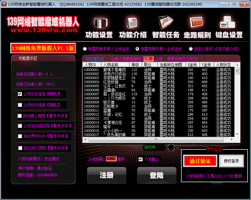 2.设置数据库完成后点注册。一键批量注册帐号。本工具一次性成生160-260个假人不等。