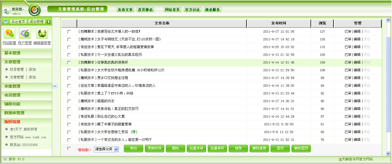 2,后台地址 www.tom6.com/admin (www.tom6.com处改为你的网址)
