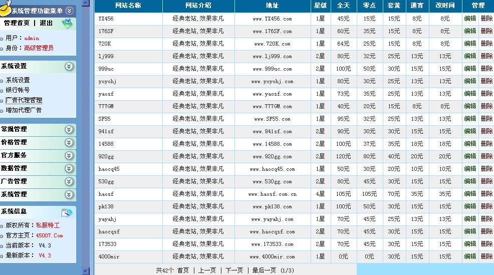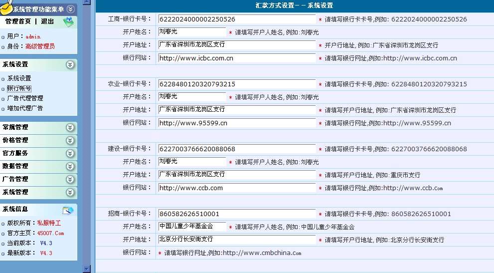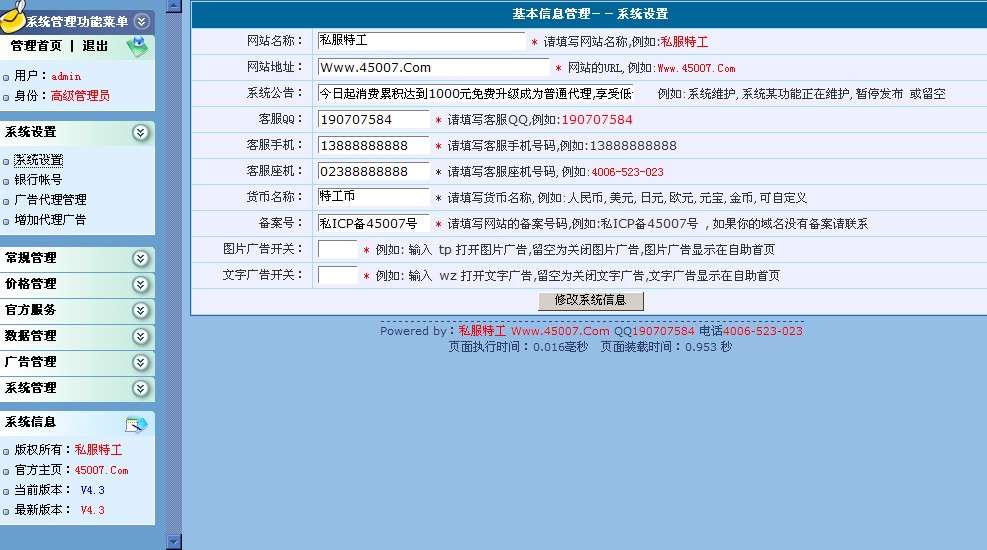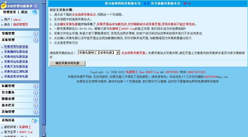 在次声明:以上功能全部开放使用,没有做任何限制,也没有任何限制收费使用,请大家放心使用,你在使用本程序的过程中,我们将终身为你免费提供更新,我们发布新版本在你的后台官方版本号会有所改变,如果你正使用的版本号和官方版本号不同,那么就需要更新,请登陆到我们的网站,www.45007.com 下载更新程序,以及更新日志.