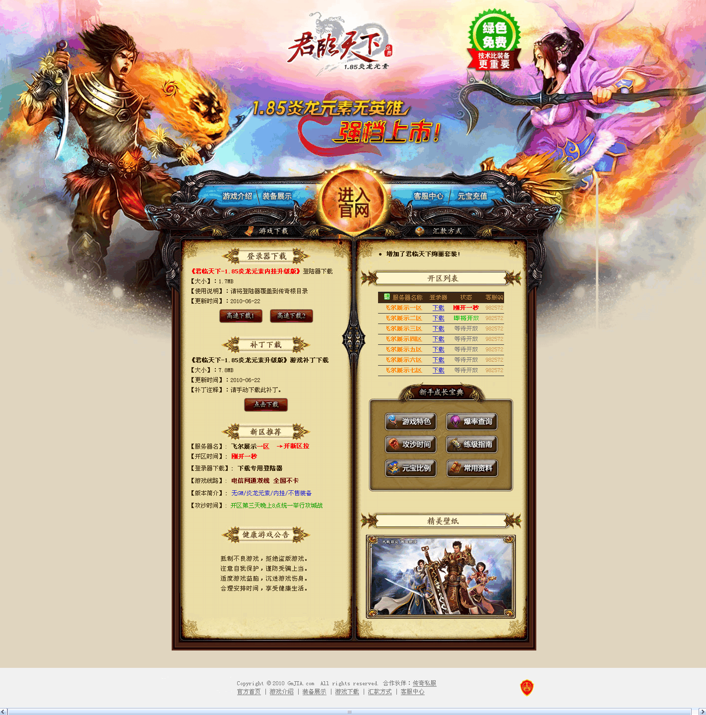 简介: 专业的美工,漂亮的格局,超级绚丽,游戏人物为背景,更突出游戏网站的意义,为你的游戏更添一份魅力,全HTML静态页面,本款网站你只需要把 图片上的文字和网站 方便GM自己添加标题美工!