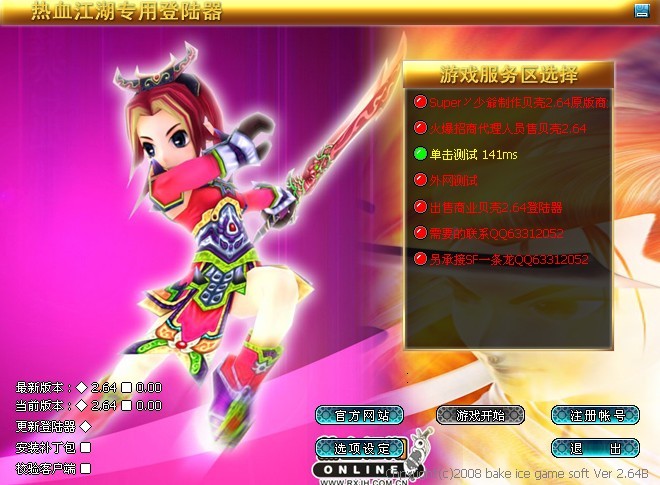 下面打个广告,热血江湖原版贝壳2.64登陆器,购买请联系QQ63312052!另诚招代理贝壳2.64登陆器销售人员有意合作的,联系我QQ63312052!绝对让你赚,另免费给GM朋友们制作贝壳2.61原版商业登陆器,没开服的就不要来了,登陆器日期直接是2011年1月1日过期省得麻烦,凡是在我这买登陆器的我们可以免费送你们5个登陆器不一样外观模板