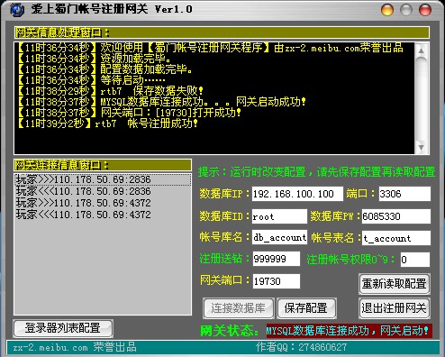 本蜀门注册网关由 爱上蜀门独家免费发布!程序作者QQ:274860627误报说明:本程序由于操作数据库,可能会被杀软误报,将本程序添加至白名单即可!本程序绝对无毒,无后门,无木马,请大家放心使用!
