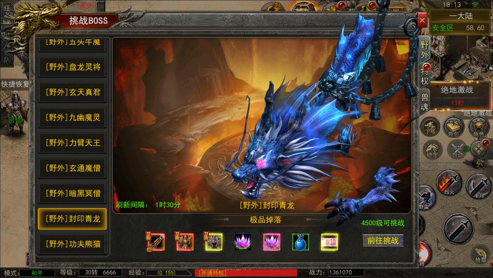 5.等级达到1000级可以打[野外BOSS]了爆率搞还掉珍惜道具和灵符.
