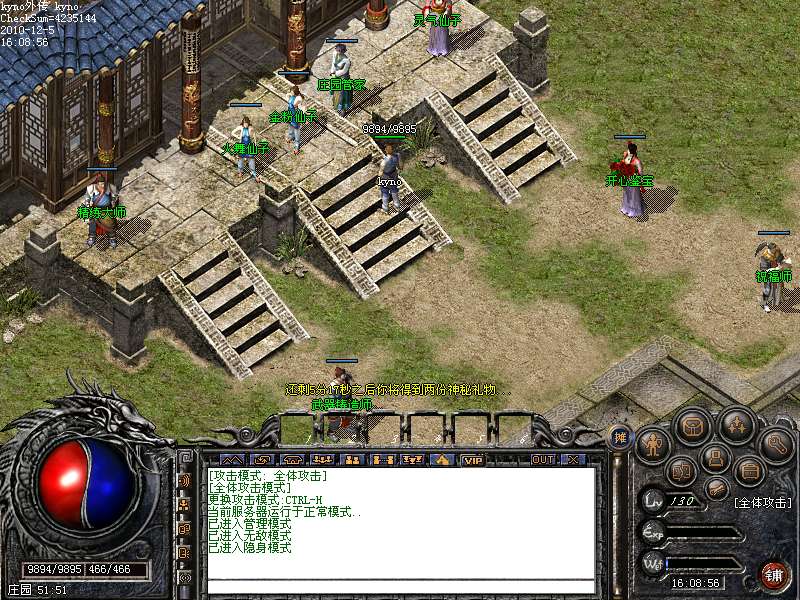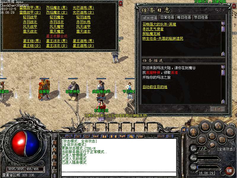 2:新加一个活动任务:比奇攻城战,比奇攻城战举行时间:11:20、12:20、13:20、14:20、15:20、16:20、17:20、18:20、19:20、20:20、21:20、22:20、23:20,比奇攻城战开始后会在<比奇皇宫门口>,刷新第一批怪物,杀死第一批BOSS之后,第二批怪物就会再次刷新出来,每一次刷新的BOSS难度都会增加,同样每次BOSS爆出的物品会逐渐增多,怪物共刷新5次,爆率已经单独提取,需要修改了改完后把爆率覆盖到版本中。