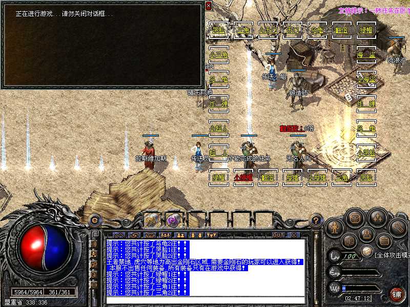 登陆本服务器需要专用登陆器,否则不能登陆,本服务器禁止任何外挂,发现使用脱机等外挂者,不管是否花钱,立即永久封号,按F12呼出自带内挂,封穿人穿怪!