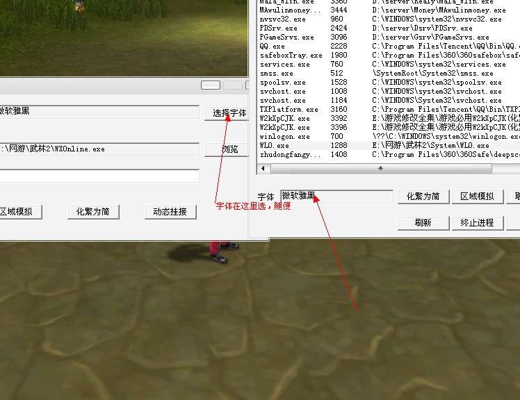 7..再启动WXOnline.exe,到进入游戏后(看截图,是到登录角色进入游戏后),再用W2kXpCJK来动态挂接