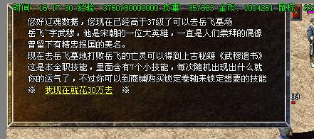 1: 增加了岳家古墓和38级的全职技能书,每个职业都可以学习的<武穆遗书>里面包含7个小技能分别是:攻击,魔法,道术,HP,无敌,潜行,经验.技能是随及出的,想锁定技能玩家可以通过到商铺购买锁定卡来锁定喜欢的魔法,锁定卡有3小时的时间限制,放心下线不会自动取消的此卡片只计算玩家的再线时间.