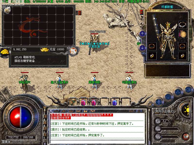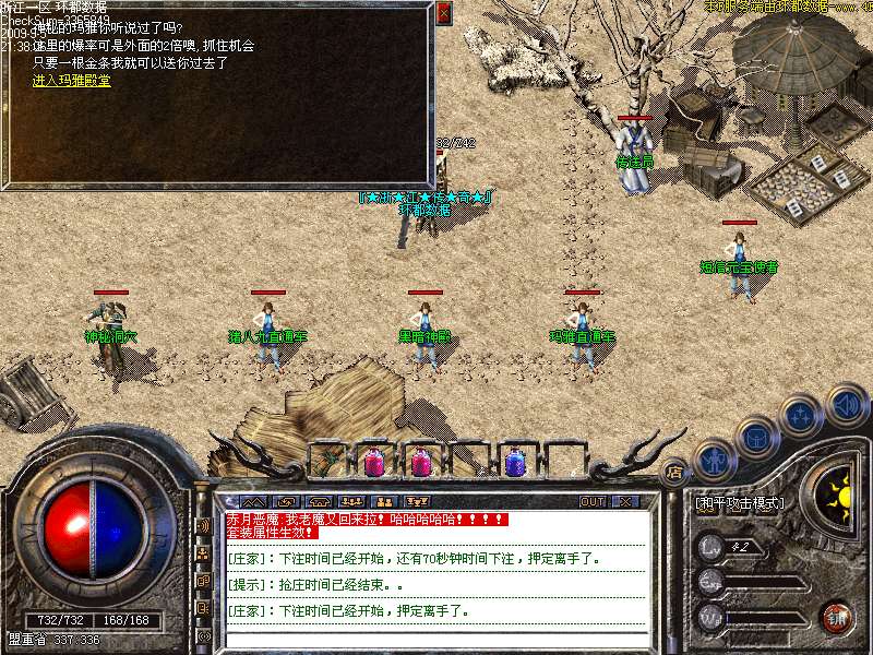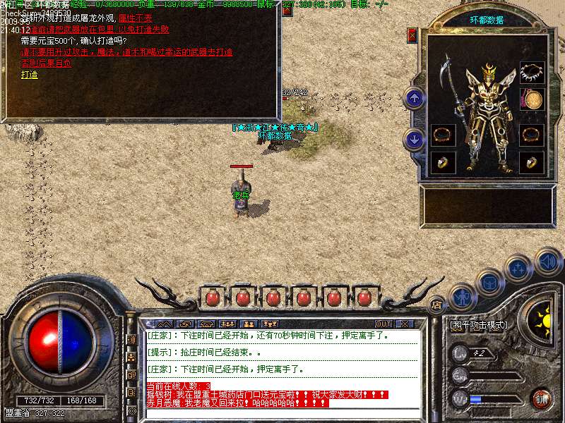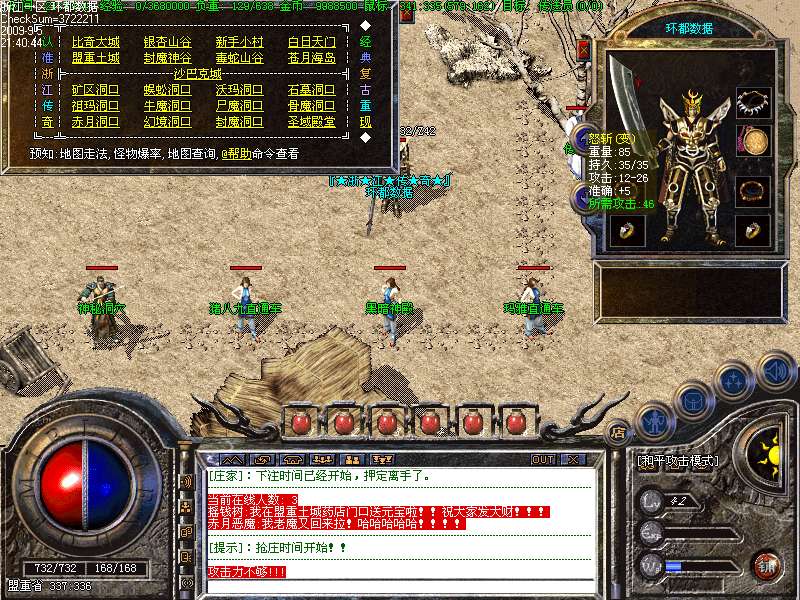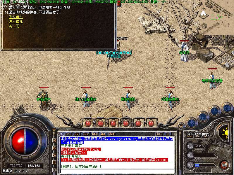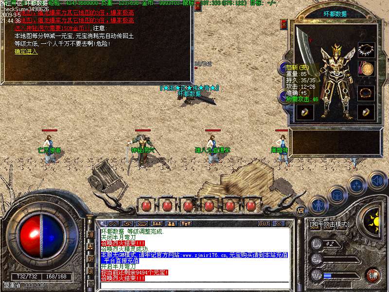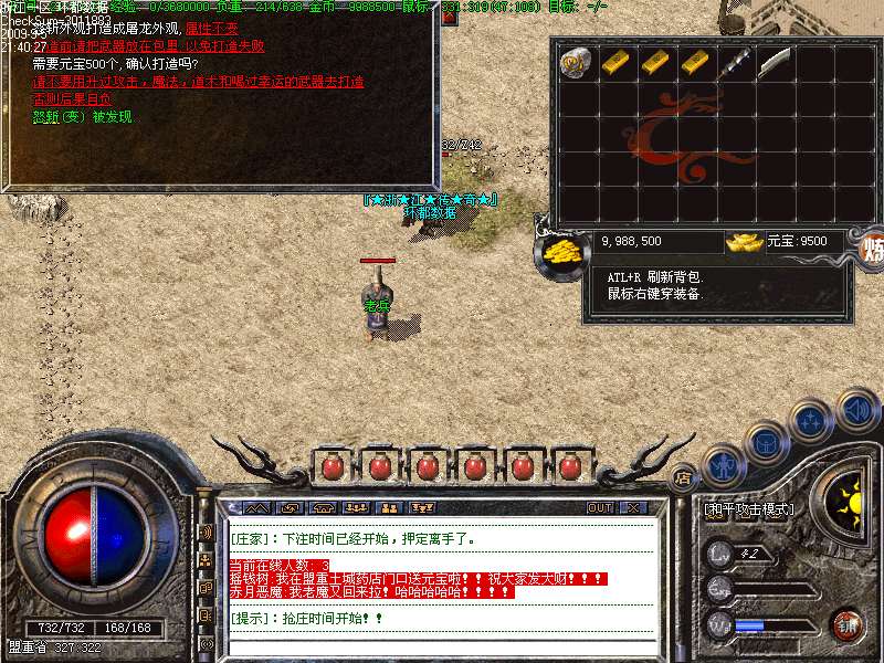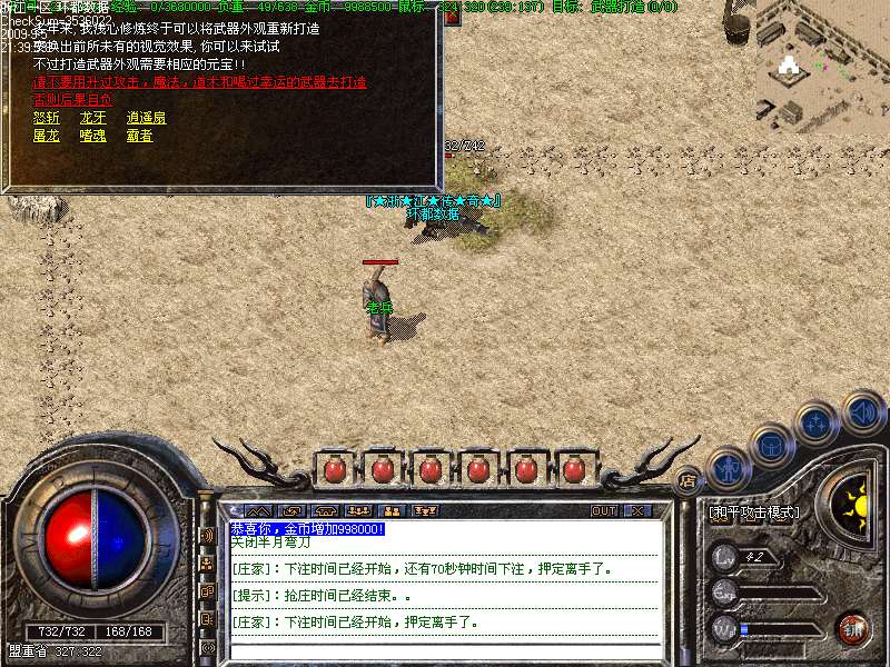 本服务器为正规仿盛大1.76版本,极品狂爆,禁止穿人.穿怪.所有怪物刷新时间与盛大同步。对本服务器有任何不明白的地方,请打“@帮助”命令,了解服务器的综合问题!!金钻玩家请打“@服务”命令!!
