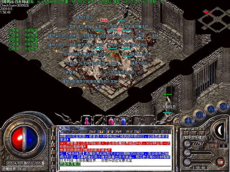 3.【特色活动】封魔谷皇宫内和土药附近每2小时刷一个老魔,系统每2小时还会在沃玛大厅举行一次大型送宝,可以暴出高级装备