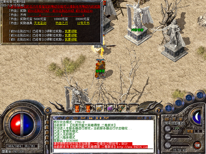 本服务器为完全盛大128区相同设置的版本,更新2008年1.950 玛法复兴、富贵金牛、后天内功、雪域、火龙神殿、英雄酒馆及雷炎洞穴的功能,在原始新战技基础上更新盛大的最新三职业新技能,四级魔法盾,流星火雨,噬血术,逐日剑法。