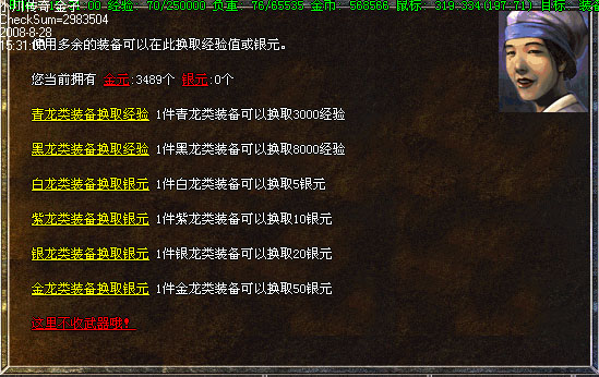 本版本装备:青龙套 黑龙套 白龙套 紫龙套 银龙套 金龙套 狂龙套 暴龙套 ( 各装备分为 攻 中 防 等级 )