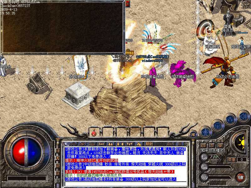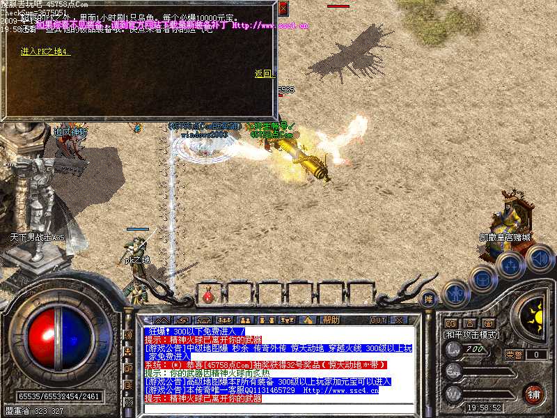 PK之地每1个小时刷2个终极BOSS,爆高级装备、经验卷和元宝。