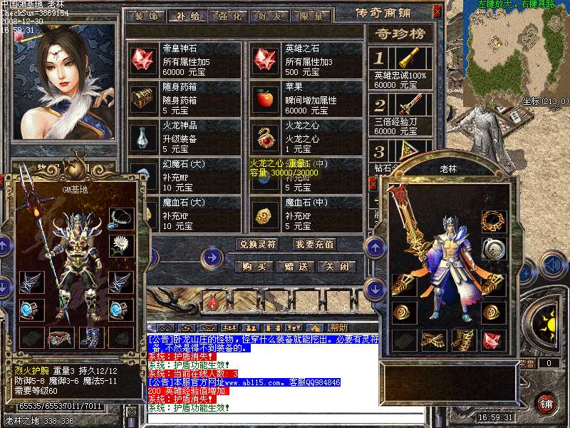 本服务器爆元宝 爆率高 增加最新仿盛大六大新技能,一模一样的英雄(决非英雄 需本站登陆器支持)操作方法与盛大完全相同,增加跟盛大一模一样的商铺.需要专用登陆器支持.(在本站几秒钟即可下载登陆器) !.修改气血石.魔血石.幻魔石为任何职业可佩带.(气血石加血.气魔石加蓝.魔血石蓝血都加 并对加血速度做了详细的调整).增加了变色的天下第一雕像的NPC;让您在游戏里更家有王者风范 并可得1.2倍经验!,修改守沙奖励为装备或元宝(可选)!增加了首饰合成回收功能,给普通玩家一个公平的环境.经过数日的测试 完成游戏的整体协调性;升级速度 怪物爆率 装备属性 PK职业平衡性做了重大调整(本服决不是让普通玩家没办法生存的游戏类型).副本地图里面的暗黑帝国 星空 地下城等图 适合打宝,尤其适合行会团队打宝。怪物爆火龙.精灵。无敌。英雄。狂雷系列装备和元宝 调整了3个职业的平衡性,调整了以往道士比较弱的问题,增加道士火符威力.宝宝威力.增加超级合击技能