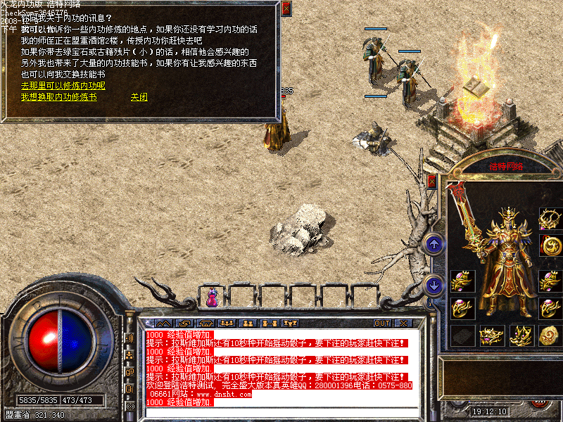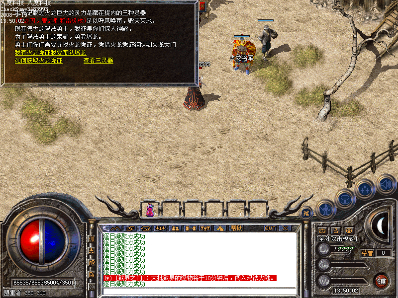 上线送英雄技能,合击书商店卖,人物到45级可以到白日门龙人免费领取火龙之心一个!