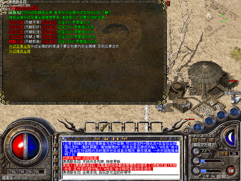 [潇洒网络]独创四大天赋技能,可以由坐骑牌升级随机获得天赋技能.四大天赋技能每样都有自己的独特属性.坐骑牌升级后也有属性加成,佩带而且能增加一定的HP,MP.越高等级的坐骑增加的越多.坐骑牌取下则消失特殊属性<游戏内测试>
