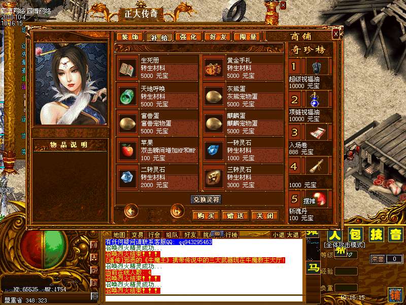 五:最新加入 月光宝盒 在土城药店下面 每一个小时将会刷出一个月光宝盒 而这个月光宝盒他不会攻击任何人 神秘中的传闻不知道是真是假据说在很久以前就已经有的这种传闻玛法大陆的居民为了打开这个秘密砍破月光宝盒神秘中的英雄就这样消失据说是被月光宝盒通过时光轮回的隧道传入一个未知的世界中去。