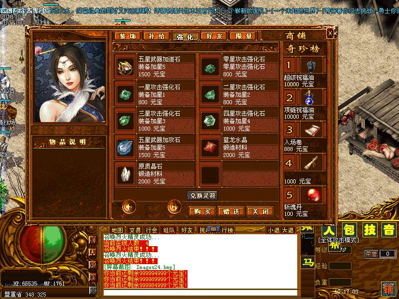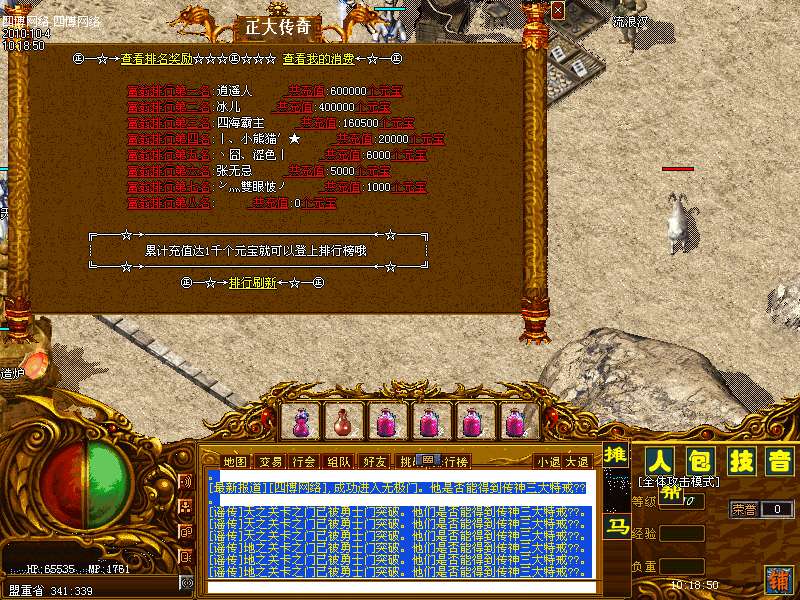 三:最新加入神秘古城事件 可以通过盟重传送员进入打开 装备地图就可以很清楚的看见[古城传送],神秘古城可以查询古城NPC他会提示您怎么 才能进入一个未知的世界那里面可以爆出高级装备爆率高。