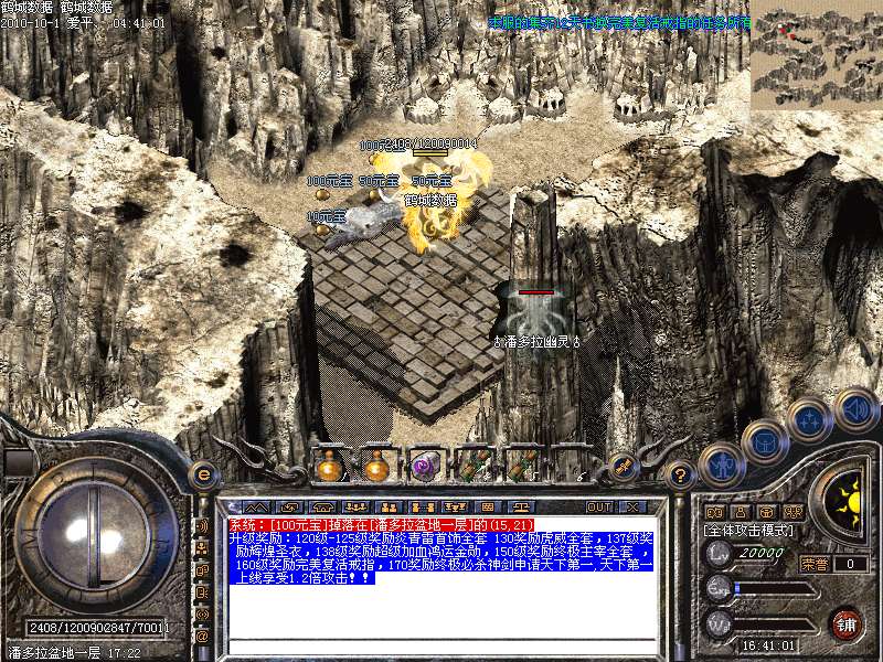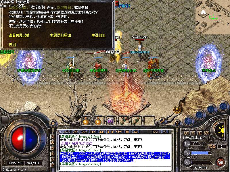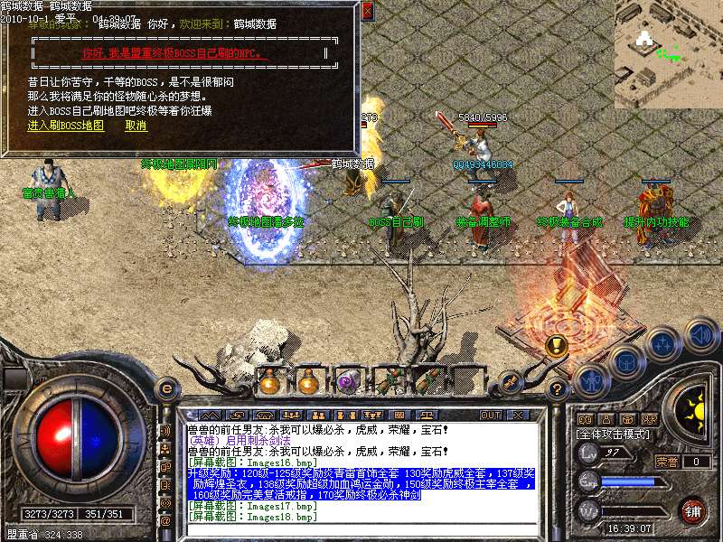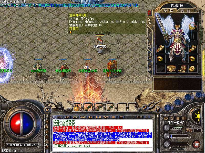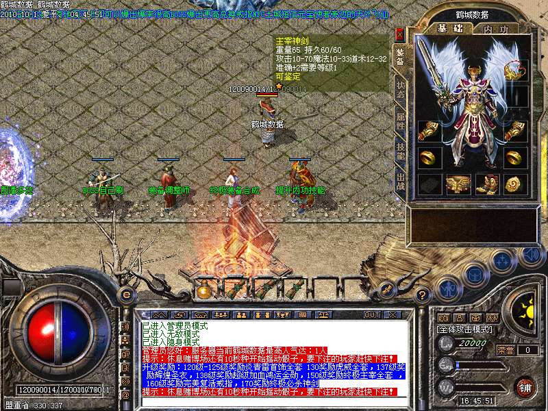 升级奖励:120级-125级奖励炎青雷首饰全套 130奖励虎威全套,137级奖励辉煌圣衣,138级奖励超级加血鸿运金勋,150级奖励终极主宰全套 ,160级奖励完美复活戒指,170奖励终极必杀神剑申请天下第一,天下第一上线享受1.2倍攻击!!