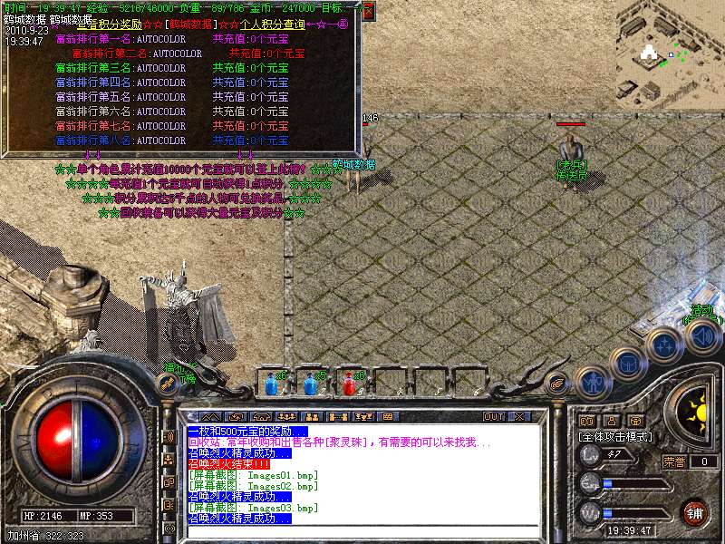 [250][活动介绍]:服务器每天晚上的22点会举行[魔殿-天降神机]活动,只要进入此殿就可每秒免费获得2500点的经验值,更有超级BOOS送豪礼(详情查土城中央的活动npc了解)...