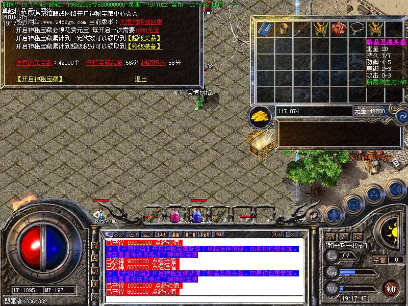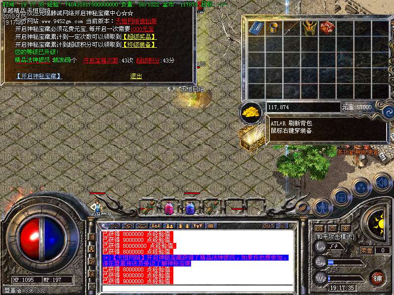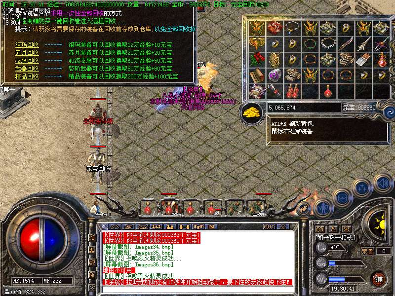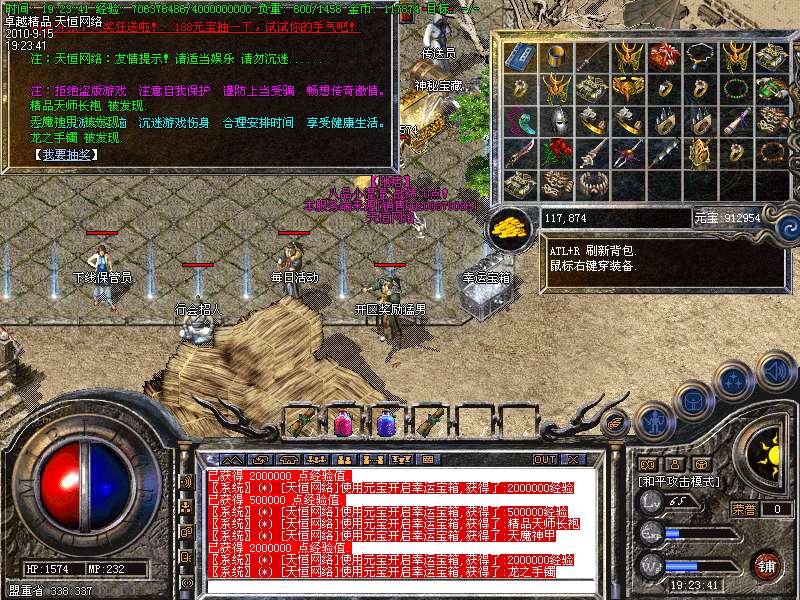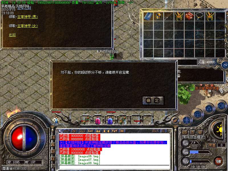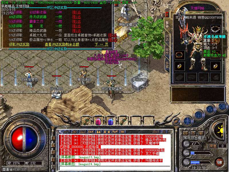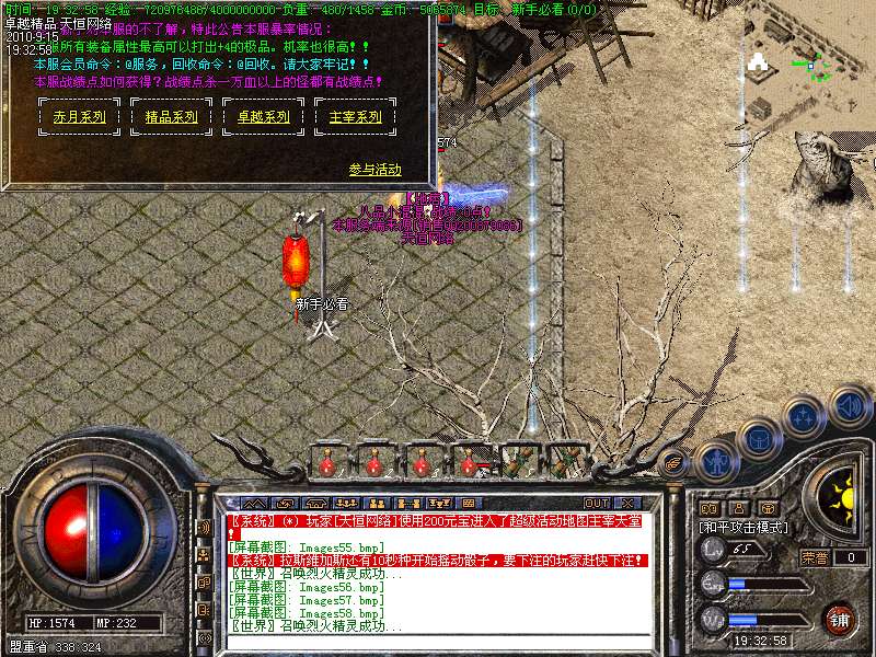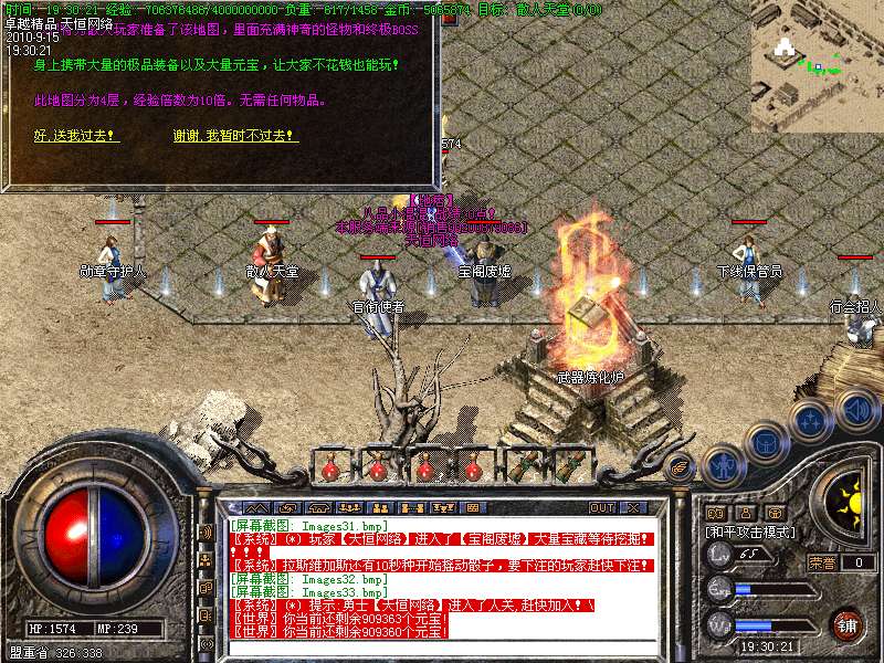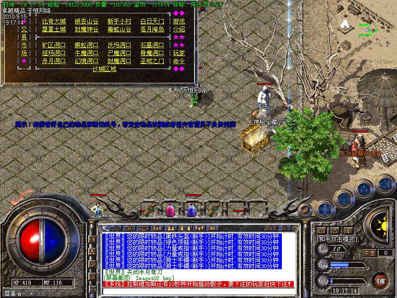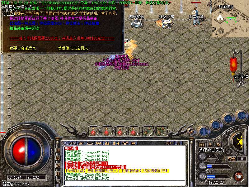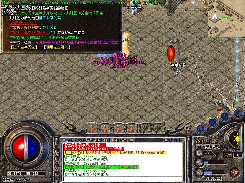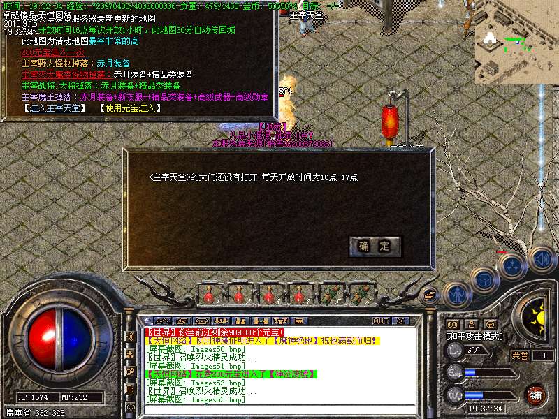 特别地图:主宰天堂为打宝天堂,每天16点开放.此地图任何大小怪物都可以有机率暴出赤月类装备和精品首饰、终极武器!